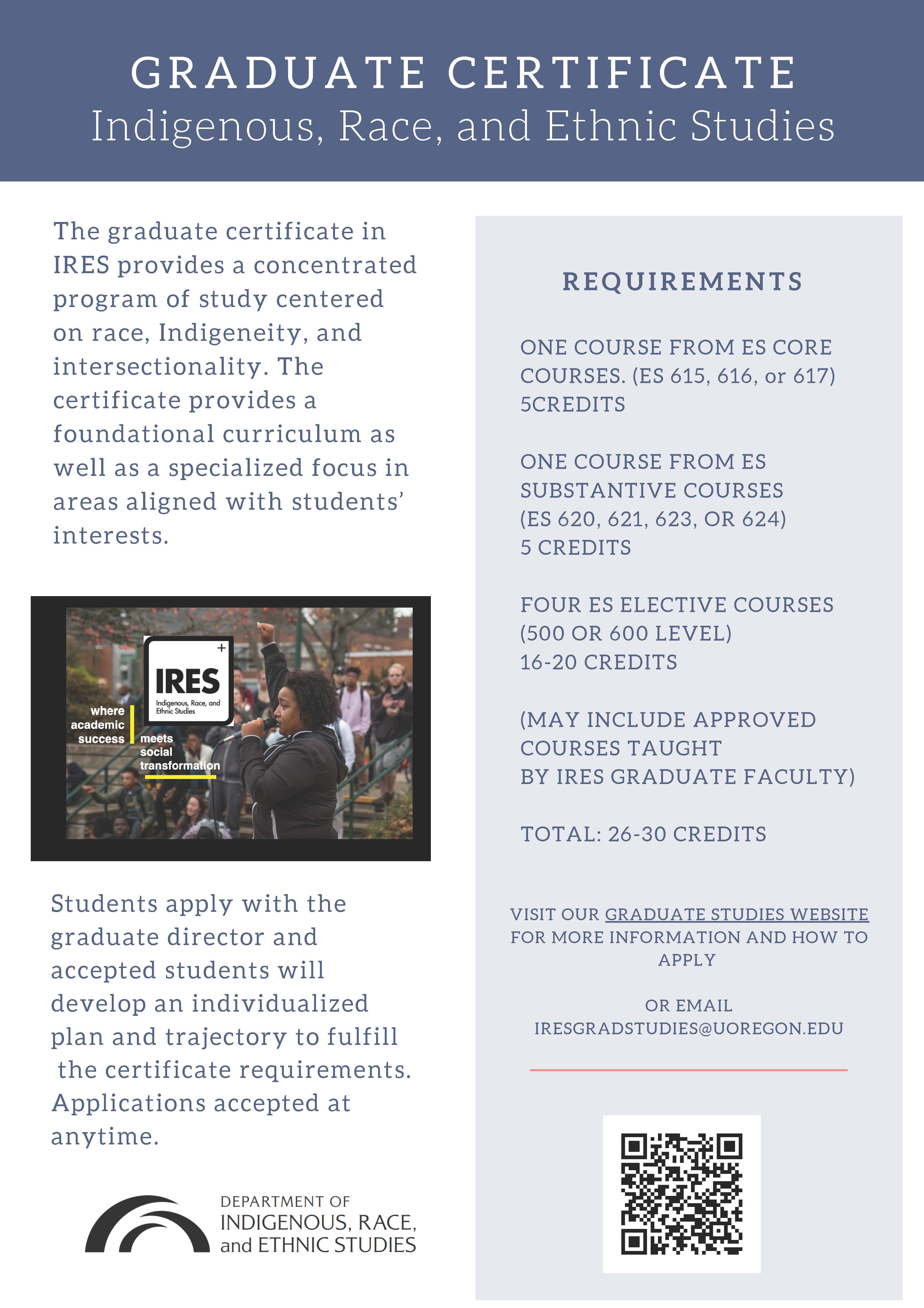The graduate certificate in IRES requires 26 credits in courses approved by the IRES graduate director. Graduate students will develop their curriculum plans with the ethnic studies graduate director to best complement individual needs and goals for their graduate studies. Courses not taught by graduate faculty may be approved by the director of graduate studies for the certificate. To earn credit for the certificate, students must take: